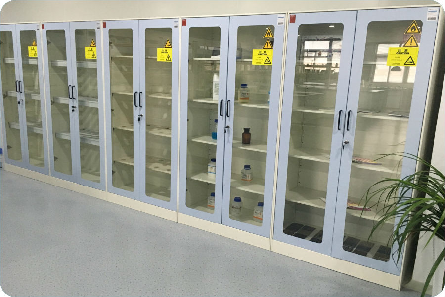 药品柜:是化学实验室必不可少的橱柜。主要放置固体化学试剂和标准溶液,这两者必须分类放置,不可混放在一起。放置化学试剂应分类放置,便于查找。同时为了安全,药品柜应设置玻璃门窗,柜体也应具有一定的承重能力和防腐蚀性。